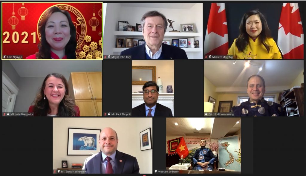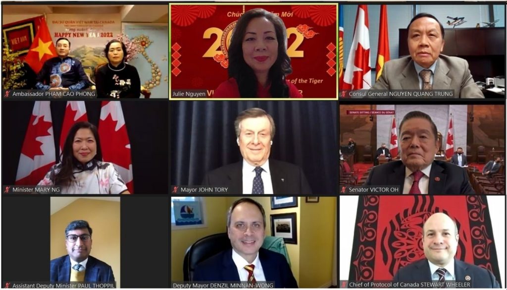 Photo: Ambassador Pham Cao Phong, Consul General Nguyen Quang Trung, Minister Mary Ng, Senator Victor Oh, Assistant Deputy Minister Paul Thoppil, Mayor John Tory, and others.